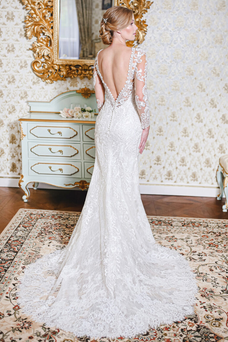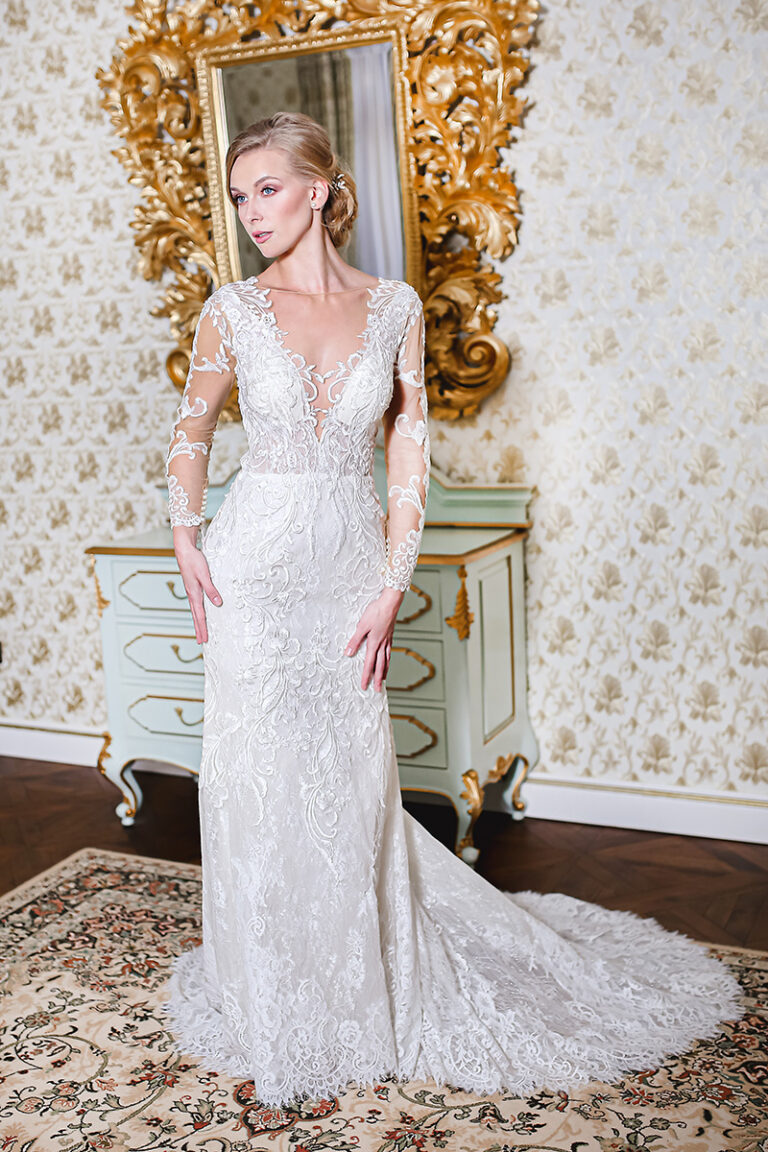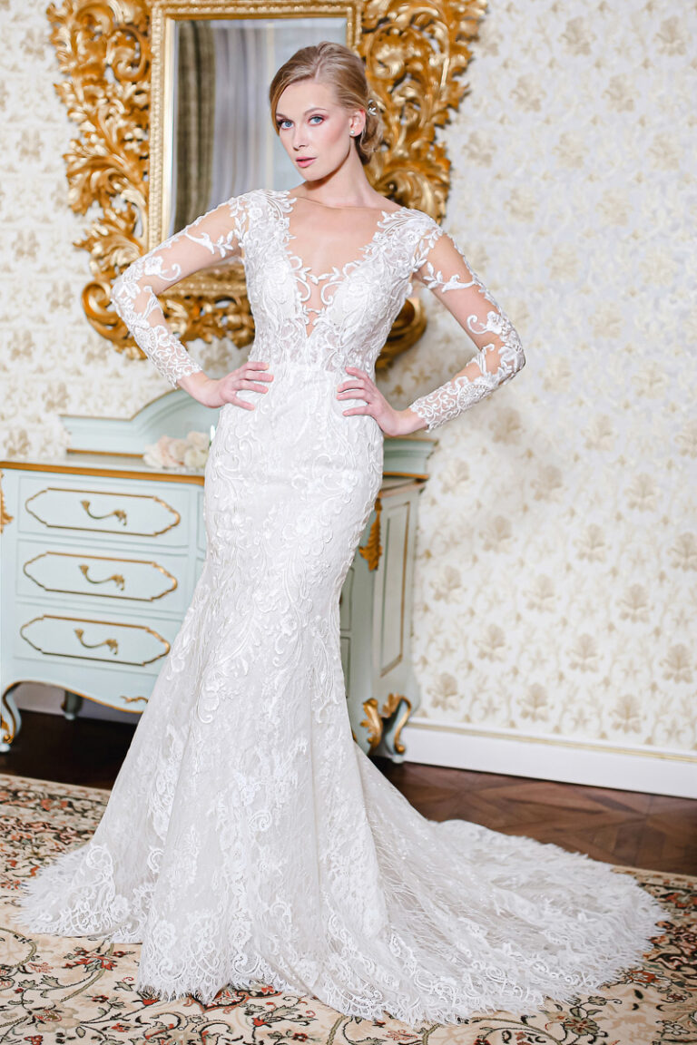 Elegance je zosobněna v tomto nádherném modelu BALANDRO s dlouhým rukávem ve střihu mořské panny. Šaty dokonale zvýrazní ženské křivky nevěsty. Hluboký dekolt ve tvaru V na zádech je lemován krajkou s drobnými ozdůbkami.