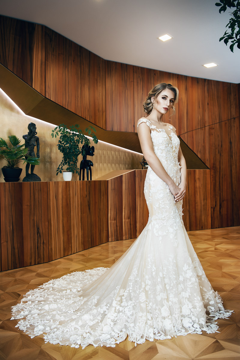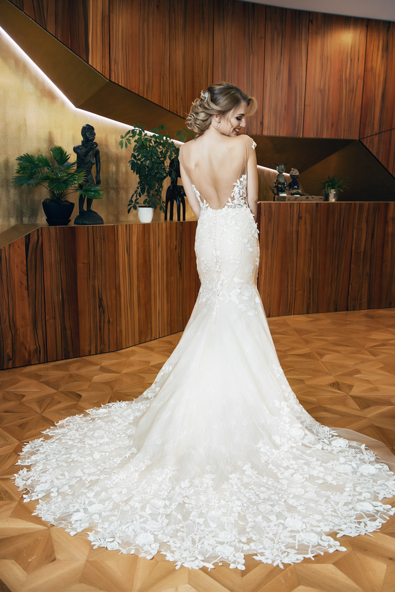 Sexy svatební šaty BIANCA se smyslným hlubokým výstřihem na zádech je zdobený krajkou s 3D efekty s květinovými vzory a bohatě zdobený lem svatebních šatů je okázalý a modelu propůjčí nádech luxuse. Pro všechny nevěsty hledající eleganci.