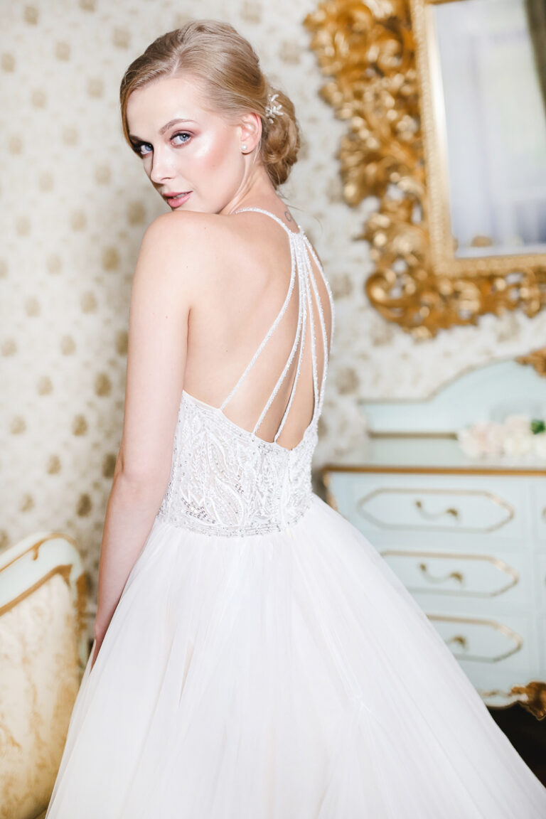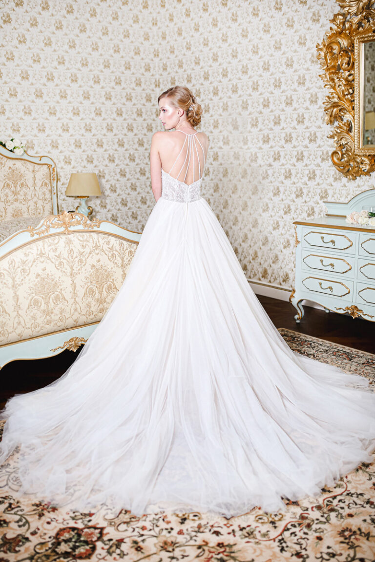 Pohádkové svatební šaty BONAIRE s bohatě perličkami a kameny zdobeným topem se srdíčkovým výstřihem, špagetovými ramínky pošité perličkami a překrásně dlouhou vlečkou v soft tylu… Už jen popis takových šatů musí v každé nevěstě, která chce ve svůj Velký den vypadat jako princezna vyvolat potřebu vybrat si je.