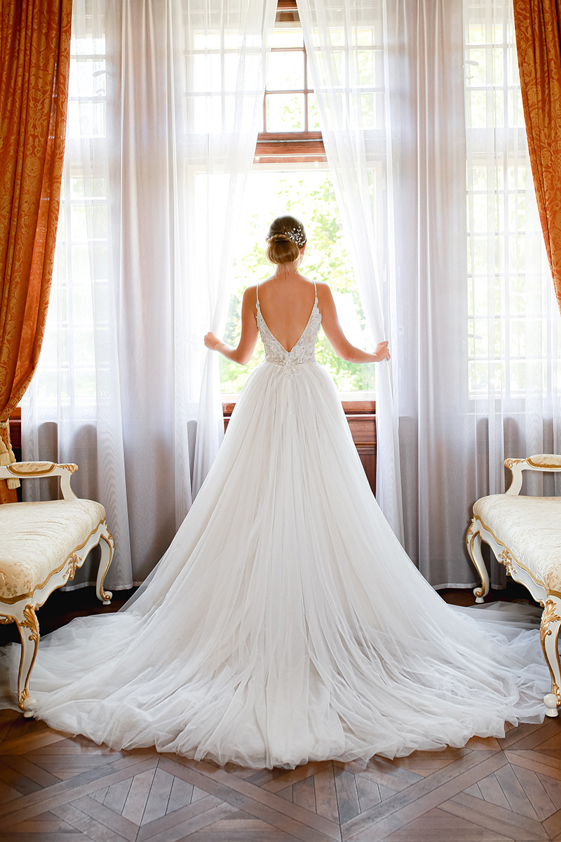Svatební šaty s hlubokým korzetovým výstřihem v dekoltu i na zádech s krajkovými detaily a bohatou tylovou sukní a vlečkou.