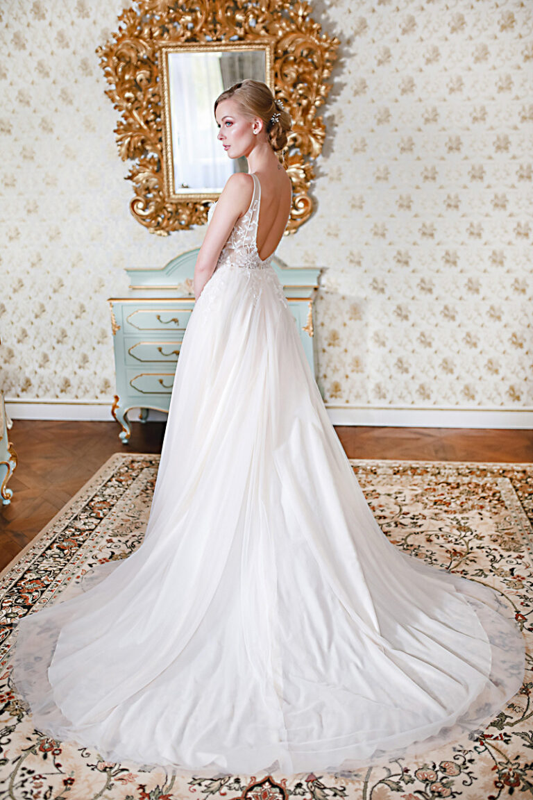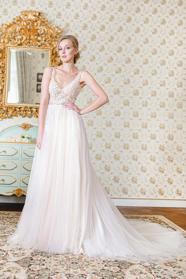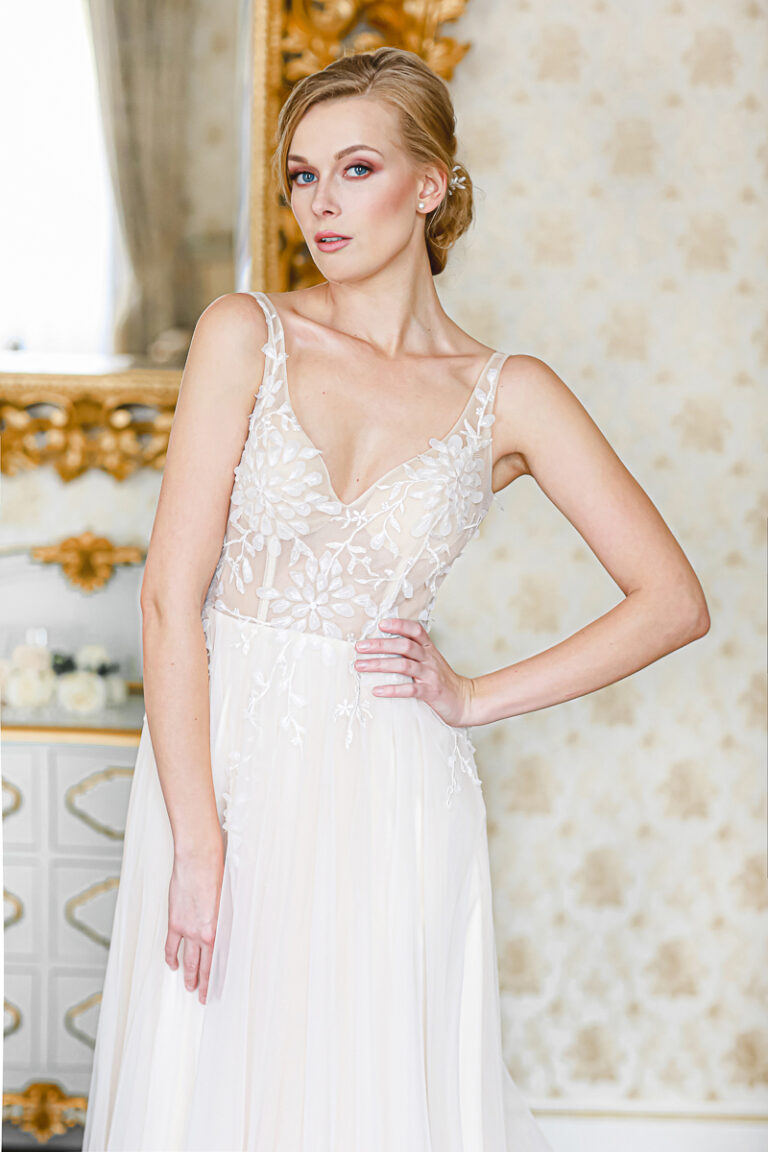 Splývavé boho svatební šaty CARLY, které se při každém pohybu rozevlají díky jemnému odlehčenému soft tylu. Netradiční zdobení šatů s lístky ve 3D efektu zajišťují nevěstě exkluzivní pocit lehkosti. Svůdně hluboký výstřih je vyvážen barevným odstínem, který perfektně ladí s barvou kůže. Šaty v neobyčejné barvě světle růžové.