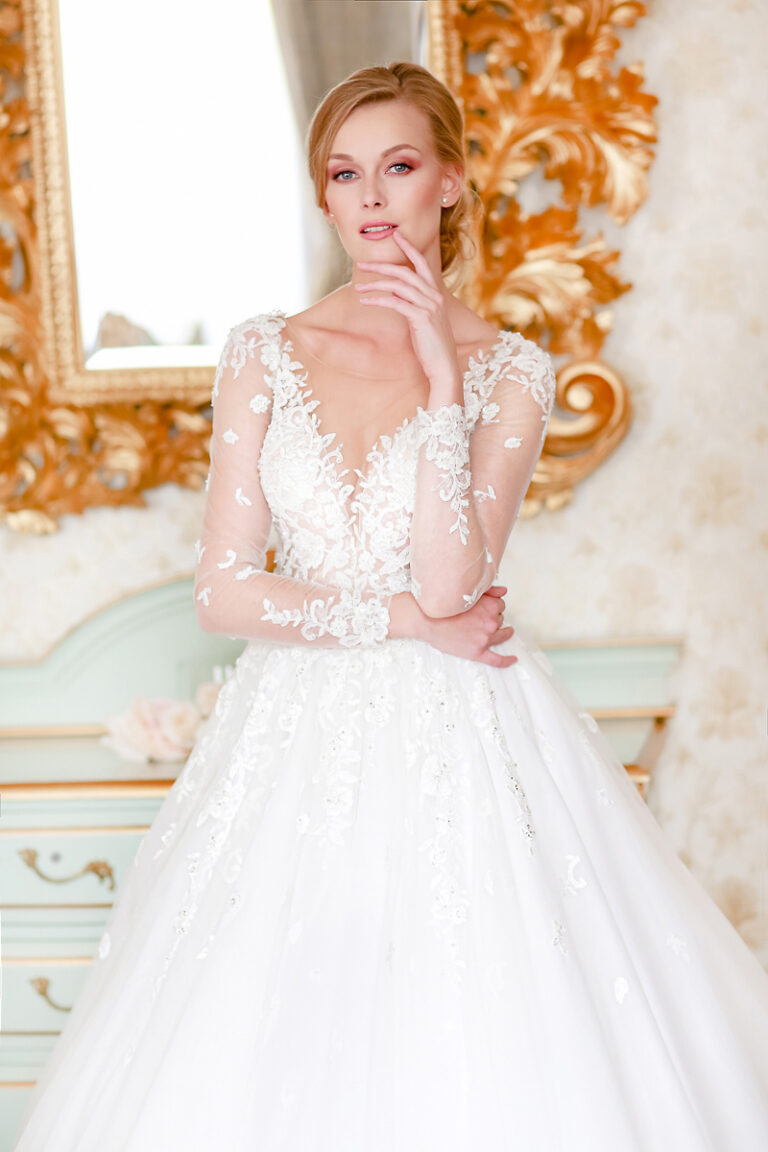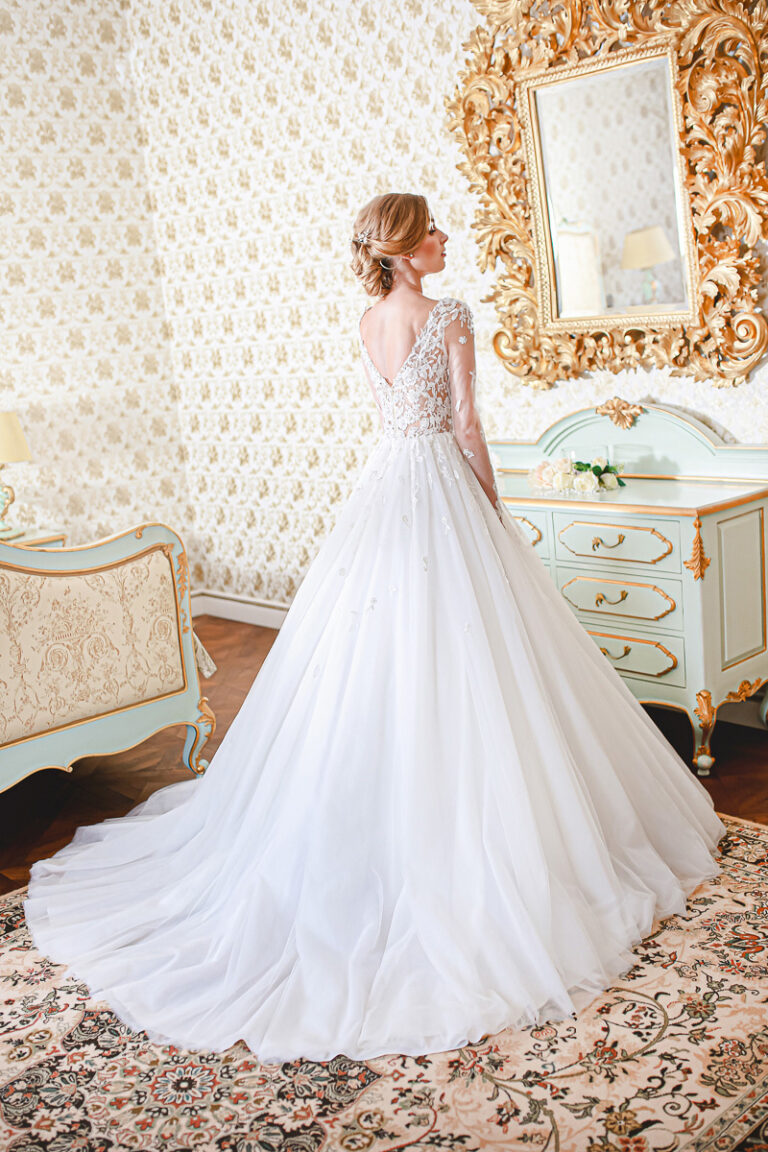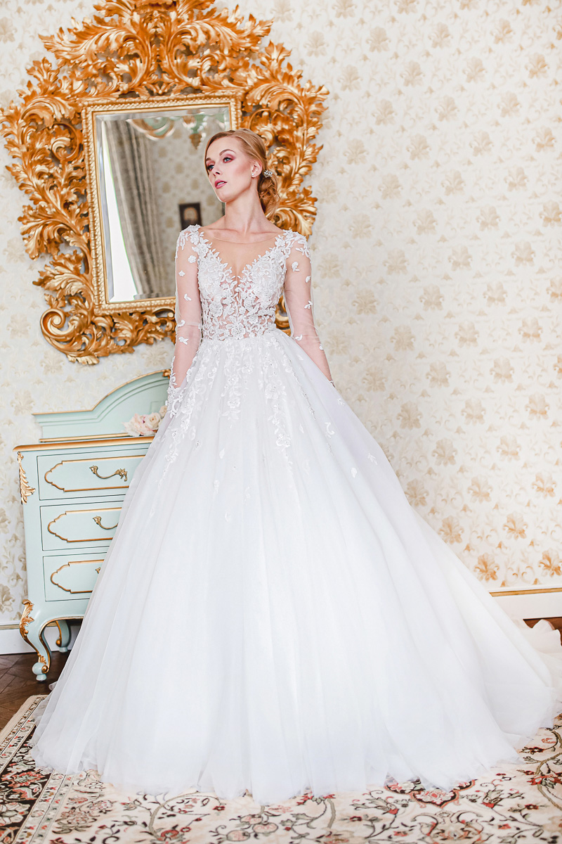 Slovy to nejde snad ani vyjádřit, svatební šaty CATRINA jsou jako z pohádky. Snoubí se zde romantika a elegance. Jemné lístečky ve véčkovém výstřihu a něžné květinky na dlouhém rukávu to vše má tento úžasný model. Dlouhá vlečka a zdobení živůtku perličkou a třpytivými kameny okouzlí snad každého.