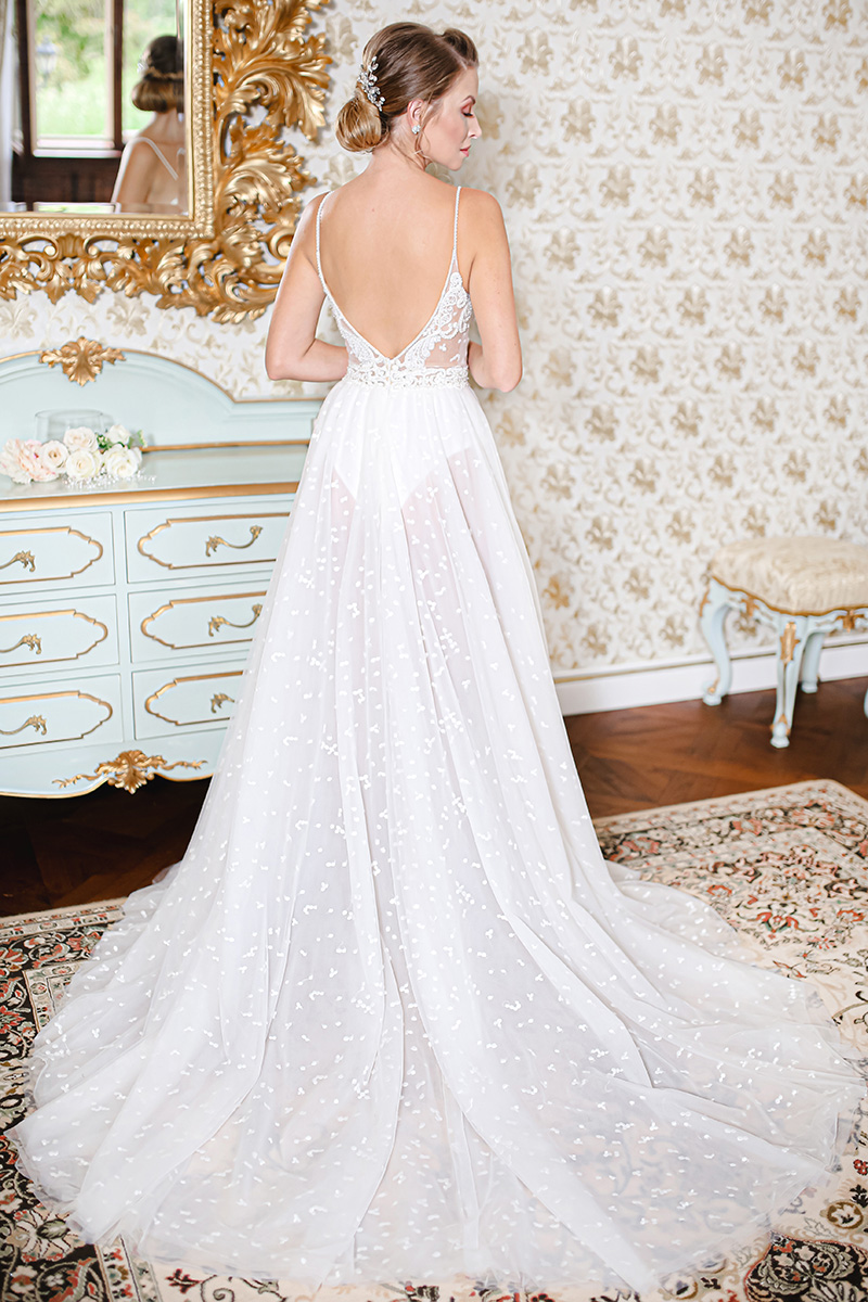 Extra sexy model CHLOE, léto, slunce, opálené tělo… o to vše si říkají tyto svatební šaty s transparentní sukní a živůtkem se špagetovými ramínky a pásečkem zdobených perličkou. Jemná puntíkovaná krajka s průsvitnou vrstvou hladkého soft tylu, body a vysokým rozparkem nenechají nikoho na pochybách, že nevěsta je sebevědomá mladá dáma.