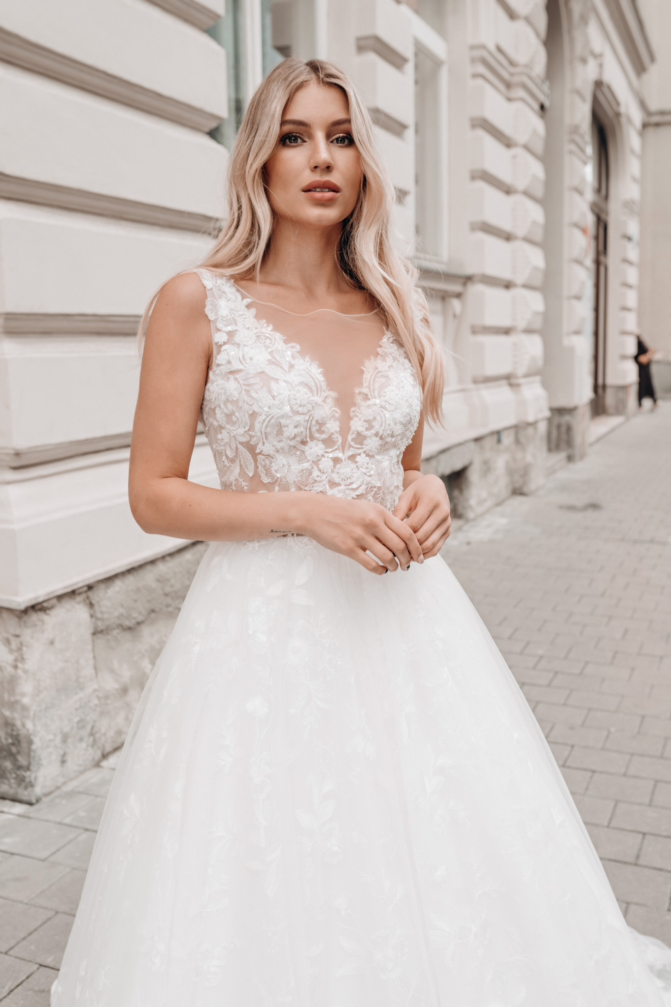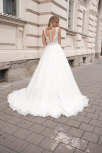 Velkolepé svatební šaty CLARENCE s jemně zdobeným živůtkem na tylu a bohatě zdobené krajkové sukni vyšívané flitry je pod jemnou vrchní vrstvou tylu svůdně se třpytící nenechá nikoho na pochybách, že před nim stojí okouzlující nevěsta.