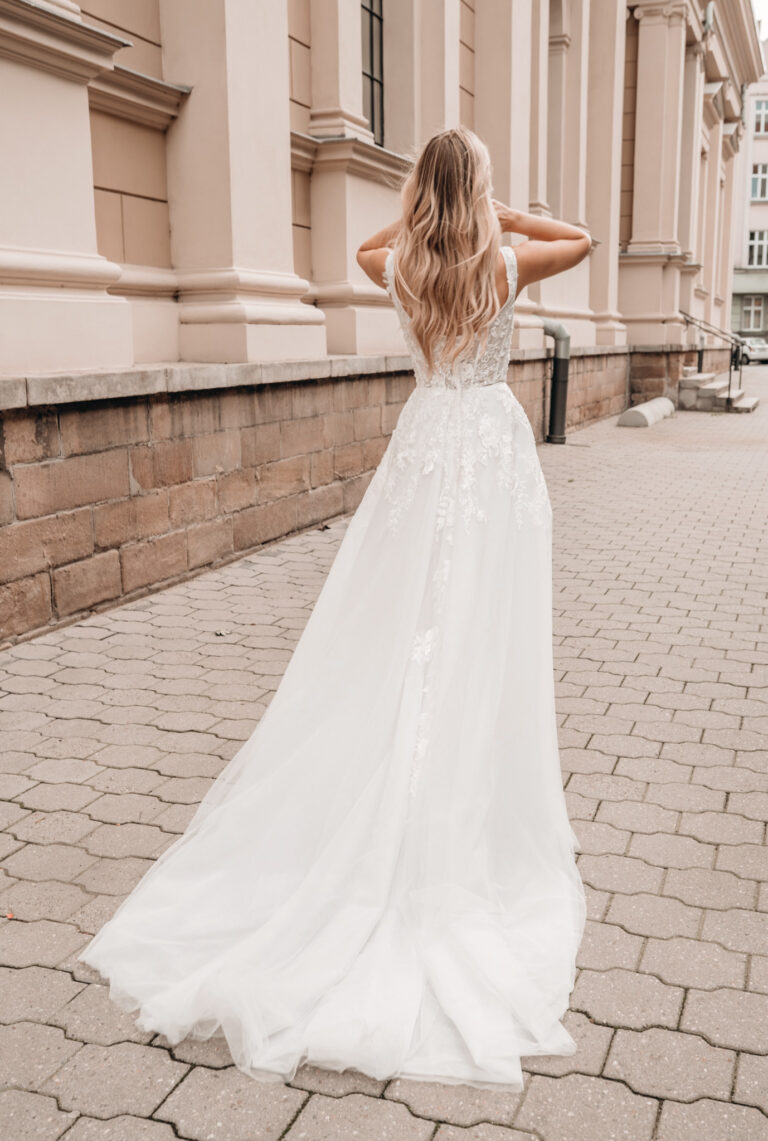 Nevšední hranatý výstřih s širšími ramínky působí nesmírně sexy. Transparentní živůtek zpevněný kosticí podtrhne nevěstin štíhlý pás a sukně ve tvaru A-line dokonale splývá na bocích. Svatební šaty DAREEN jsou určeny pro nevěsty hledající rafinovanou krásu a soulad materiálu s krajkami.