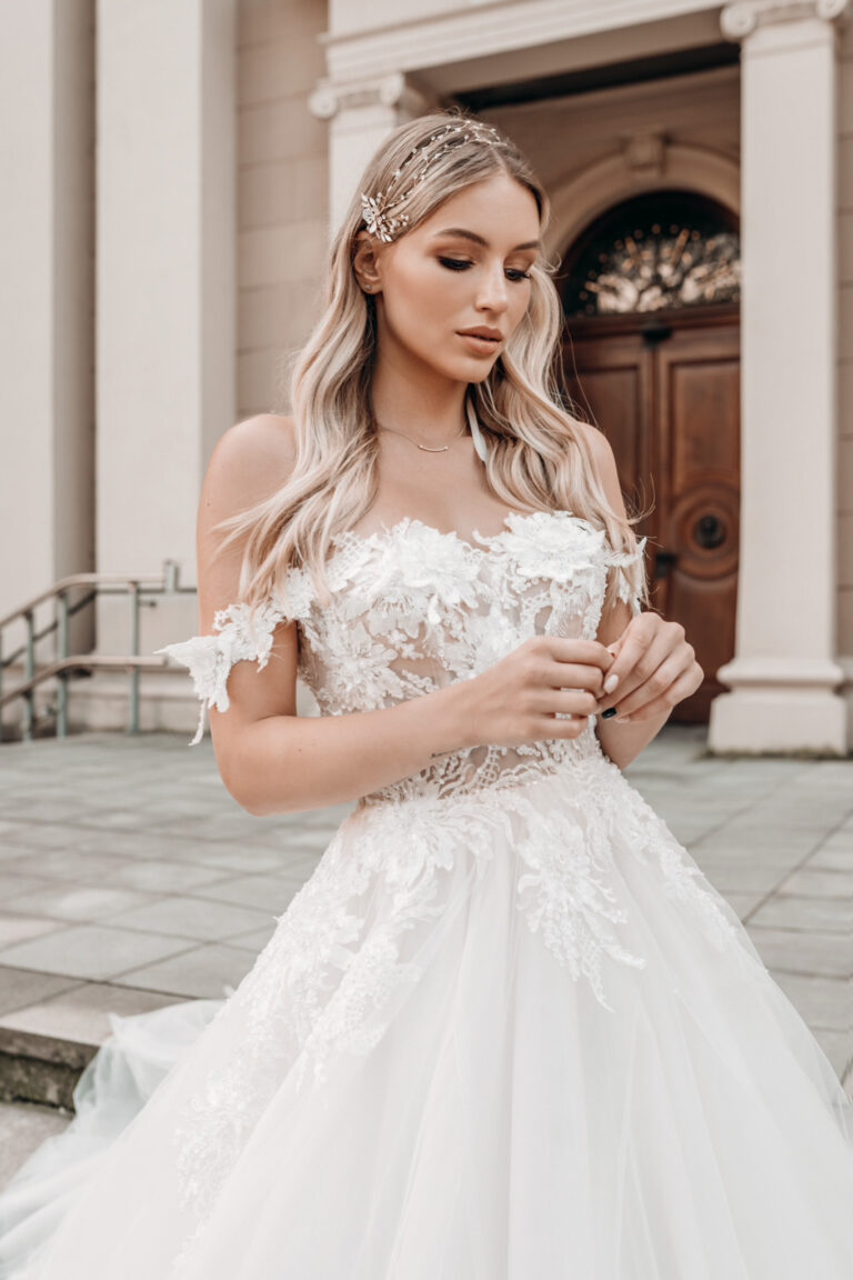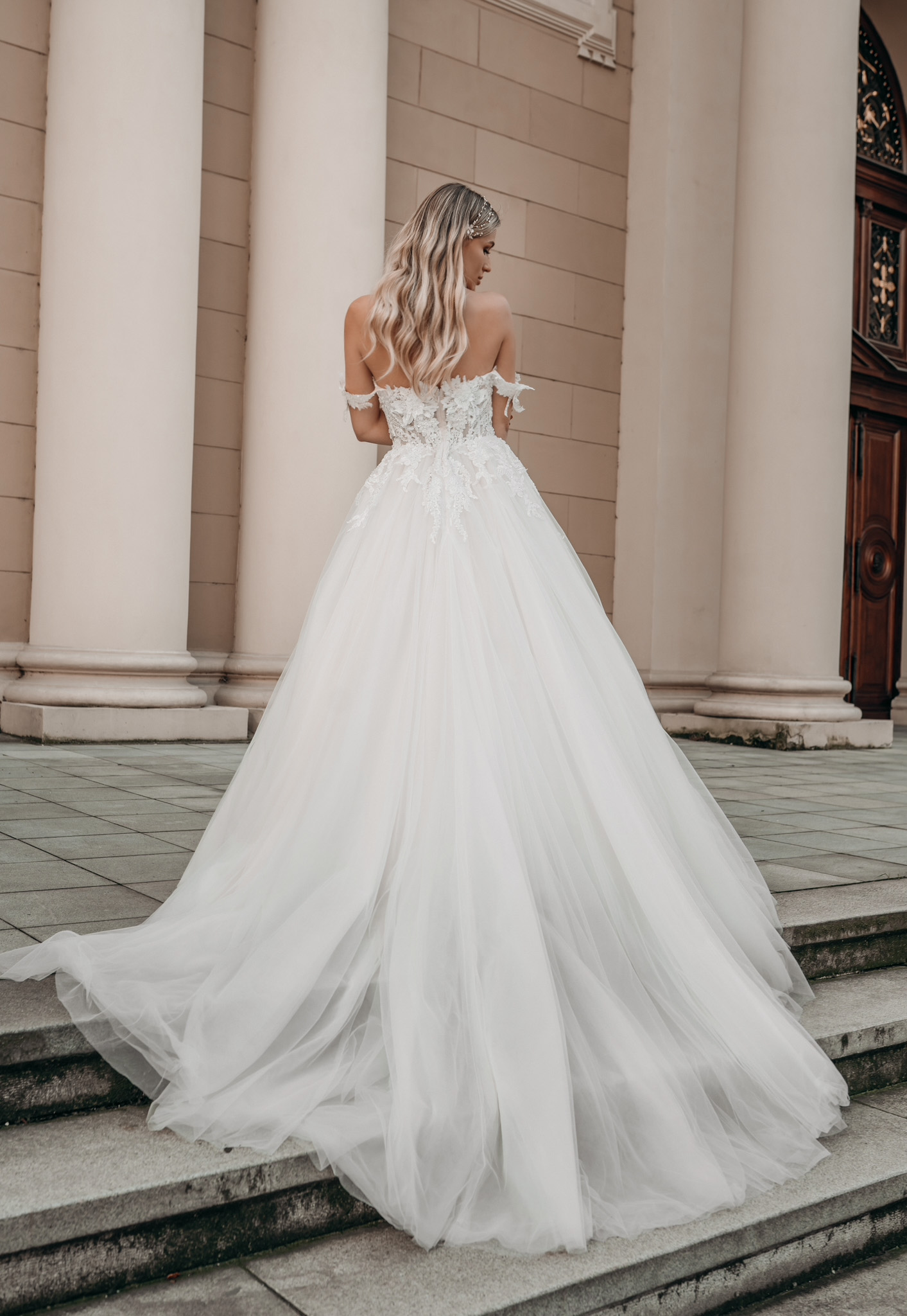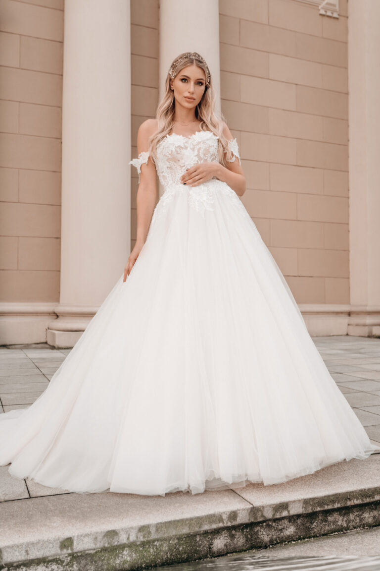 Nechte se okouzlit romantickou krásou svatebních šatů DEBORAH. Nádherná bohatá tylová sukně je okamžitě svůdná při každičkém Vašem pohybu a díky její princeznovské siluetě se budete cítit jako hvězda přehlídek. Krajkový živůtek a romantický výstřih ve tvaru srdce vyšívaný květinovými motivy plynule přecházejí do sukně. Pro nevěsty s romantickou duší.