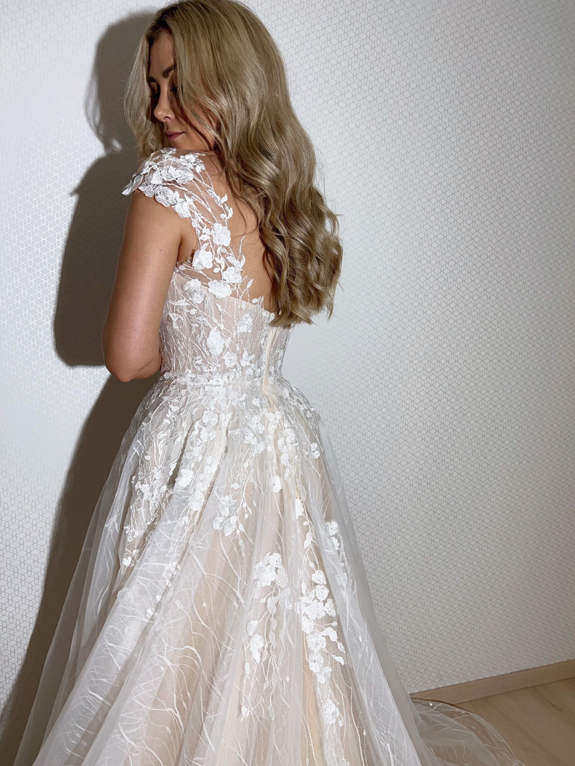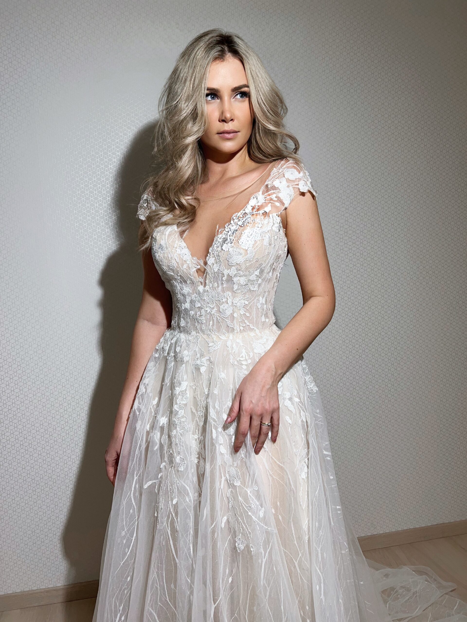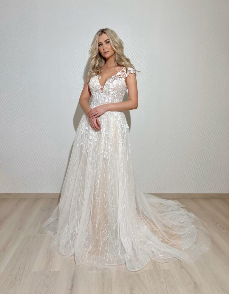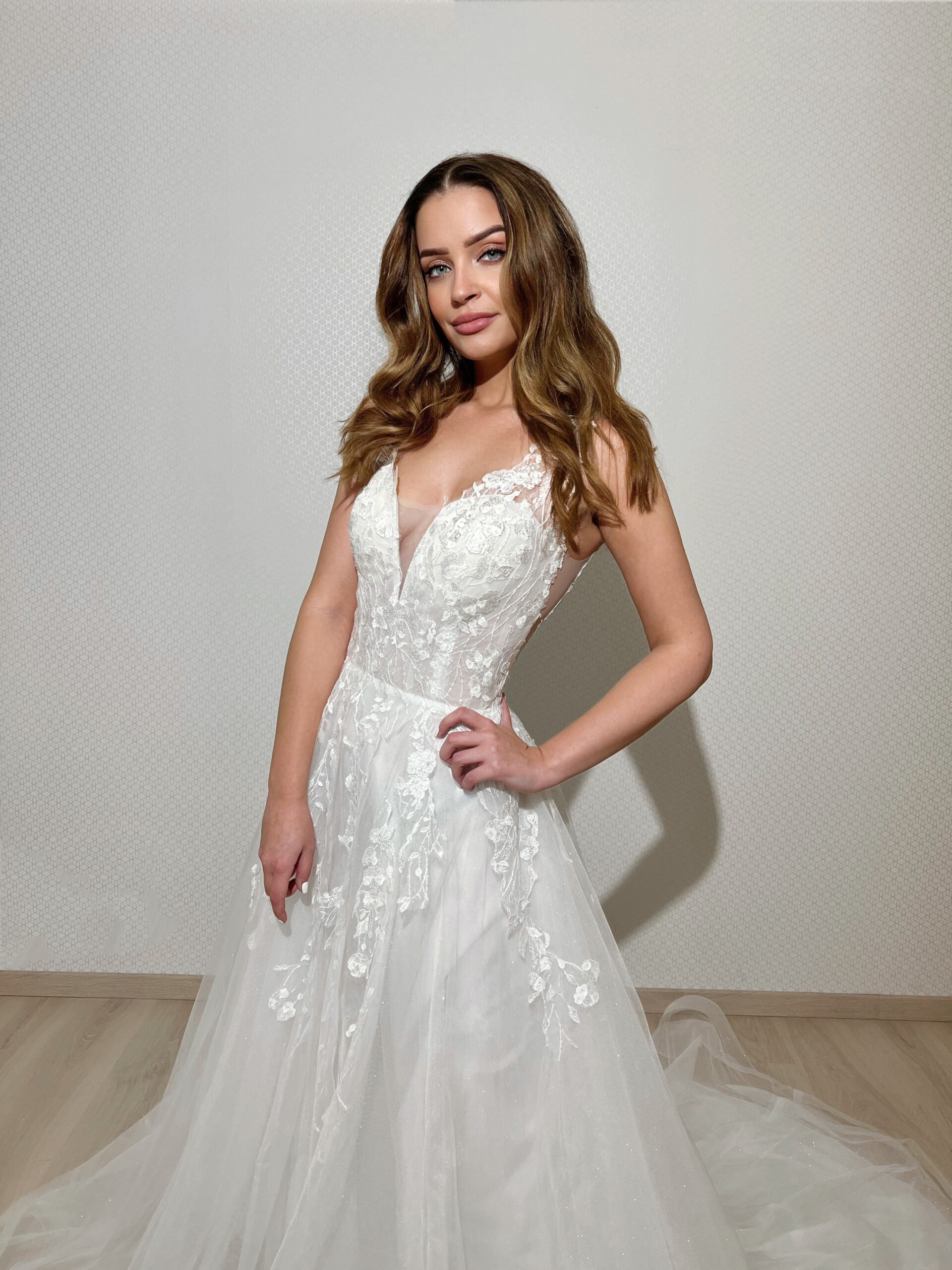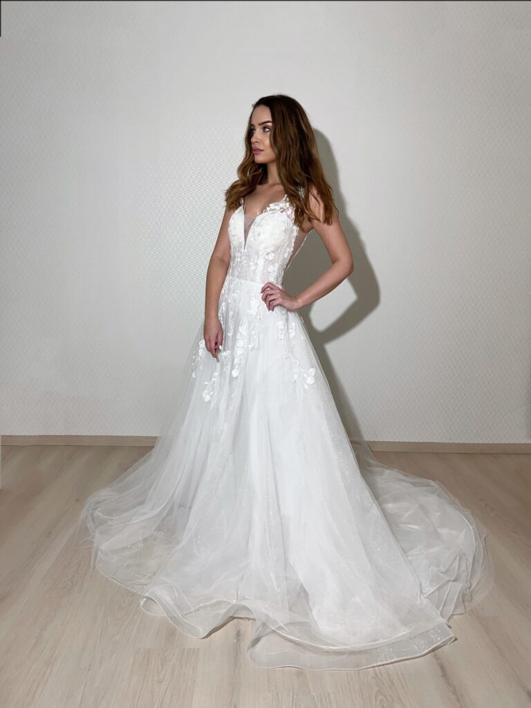 Díky nádherné výšivce s 3D efekty na šatech DESIREE okouzlí každou nevěstu, která hledá romantiku a sexy model zároveň. Odvážný detail na přední straně modelu vytváří iluzi hlubokého výstřihu až do pasu decentně překrytého transparentním tylem v barvě kůže. Zajímavý výstřih na zádech pak umocní sexy vzhled svatebního modelu. Hladká tylová sukně vše dokonale stmelí. Pro odvážné a netradiční nevěsty.