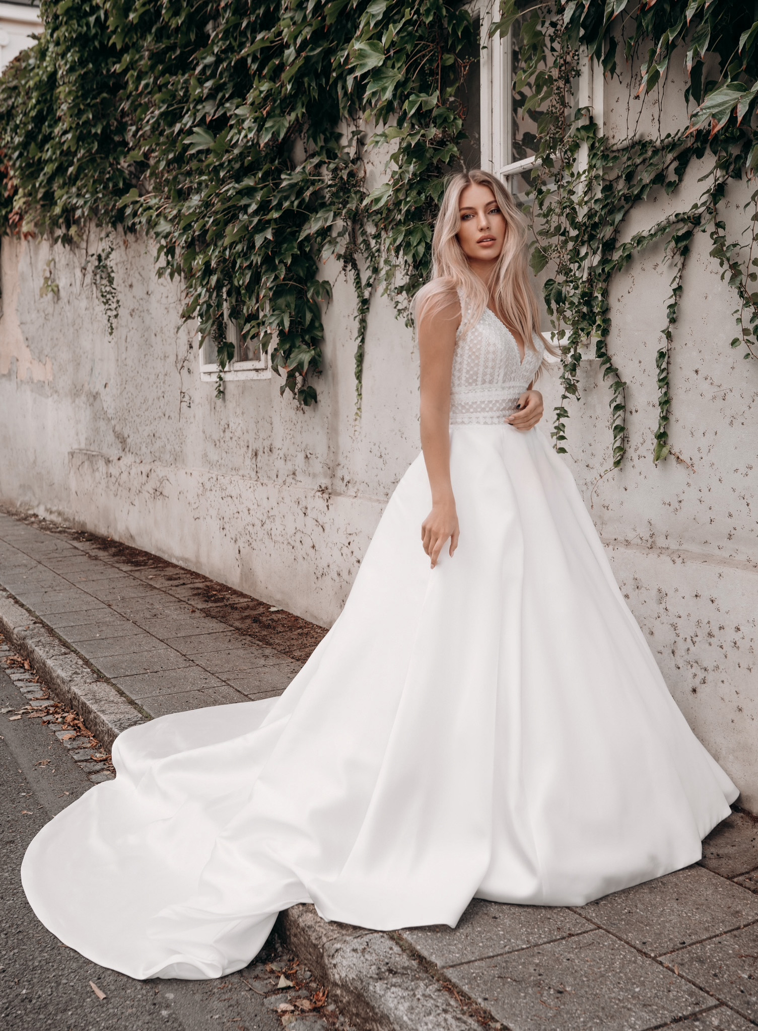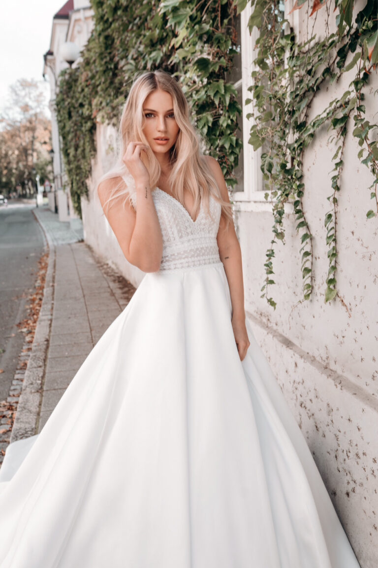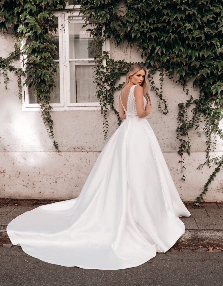 Elegantní a sofistikované šaty DIVINA  s hladkou linii sukně byl vytvořen pro nevěstu, která chce ve svůj Velký den okouzlit svého partnera i svatební hosty živůtkem s jemné krajky a vystřihem ve tvaru V se širokým pásem krajky oddělující hladkou sukni z Mikáda s rafinovanými záhyby a skrytými kapsami.